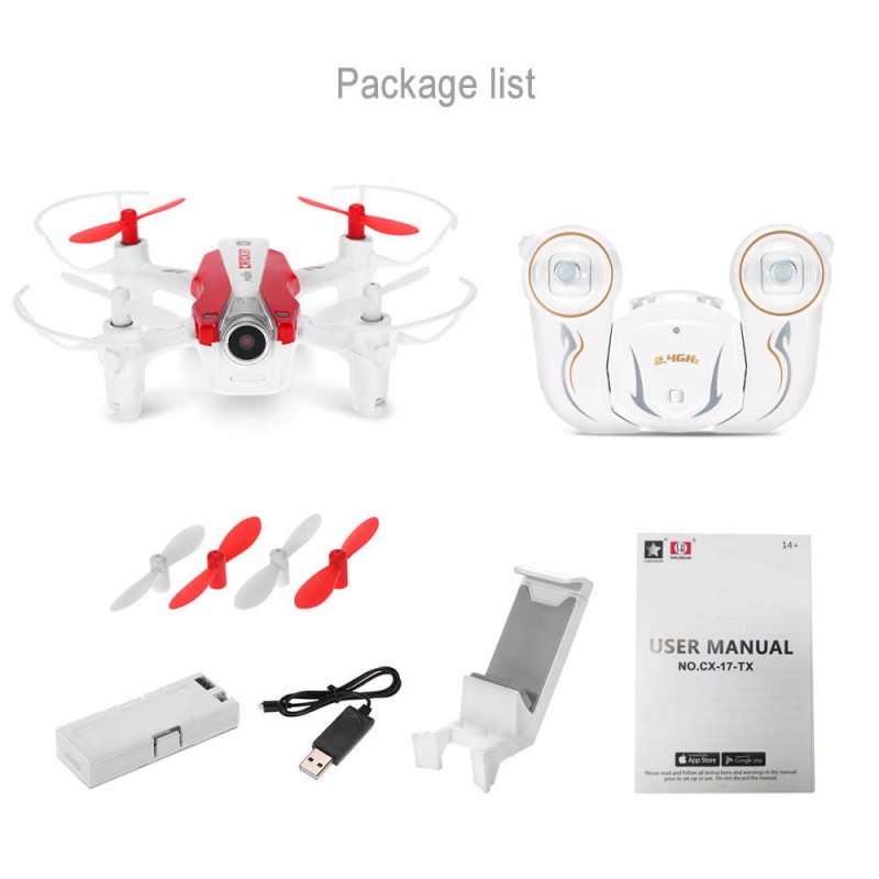 Модель CX – 17 может выполнять разворот на 180 ° автопилотом, камерой к пользователю исполняя функции селфи дрона. Удержание высоты (AltHold mode) и безголовый режим (Headless mode) чувствительно облегчают управление, особенно при ведении съёмочного процесса.