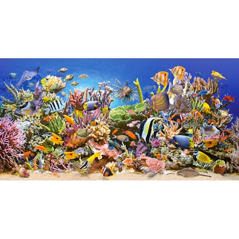 Пазл "Риф", упаковка - картонная коробка. Количество элементов - 4000 шт. Размер собранной картинки 138*68 см. Материал - картон.