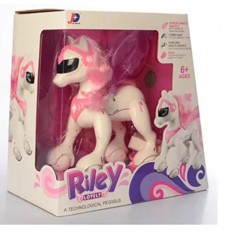 Лошадка выполнена в бело-розовых цветах из высококачественного пластика. Светящийся голубой цвет глаз и подвижные крылья унесут ребенка в мир фантазий и грез. С помощью пульта ДУ Райли может спеть песню или станцевать, выполнить запрограммированные команды ребенка или воспроизвести разные звуки лошадки. Также игрушка А009 может следовать с ребенком повсюду рядом. Кроме того, в наборе есть аксессуары на магните, с помощью которых можно покормить Райли яблоком или капустой. Глядя в зеркало и используя расческу можно красиво уложить роскошную гриву лошадки. Это мечта каждой девочки!