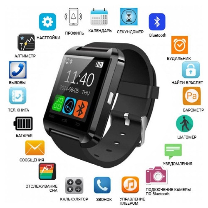 Стильные Smart Watch U8, способные служить в качестве гарнитуры, то есть с их помощью Вы легко сможете совершать или принимать звонки, в том числе и по громкой связи. Часы имеют сенсорный ж/к-дисплей TFT с диагональю 1.48 дюймов, на котором помимо времени отображается также текущая дата с днем недели, иконки bluetooth и уровень заряда батареи и иконки наиболее важных приложений, таких, как звонки, контакты или почта. Таким образом, при получении электронного письма, пропущенного вызова или оповещения с каких-то приложений, их можно просматривать прямо на дисплее часов. Поддерживается удаленное управление камерой смартфона. Также можно менять стиль отражения времени на дисплее часов: цифровой или аналоговый.